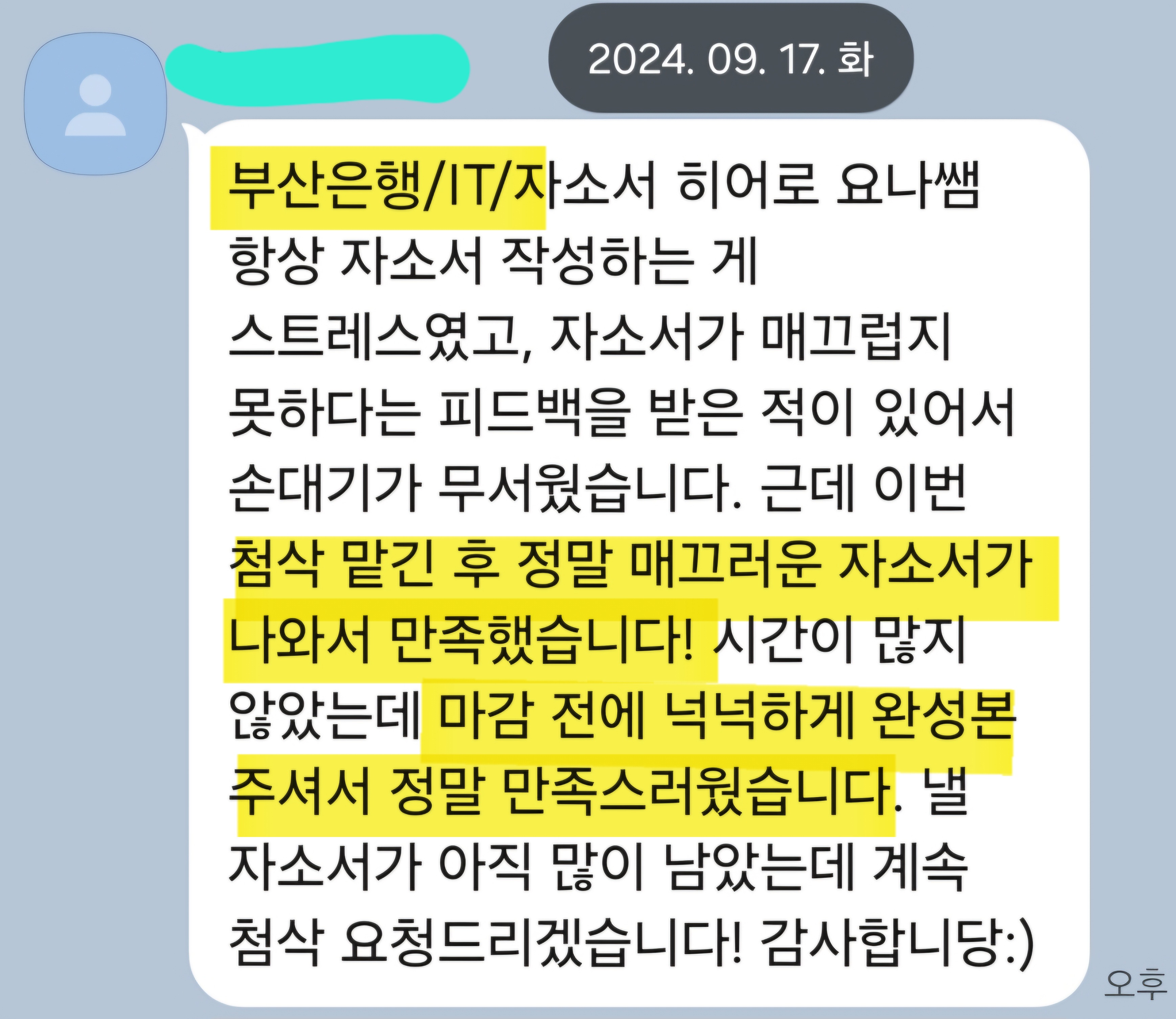 기업 정보와 직무별 특성을 반영하여 차별화된 자기소개서를 완성해 드립니다. 24시간 내 합격을 위한 맞춤 자기소개서 첨삭 및 대필 서비스를 제공해 드리니, 고민하지 마시고 지금 바로 상담해 보세요.
