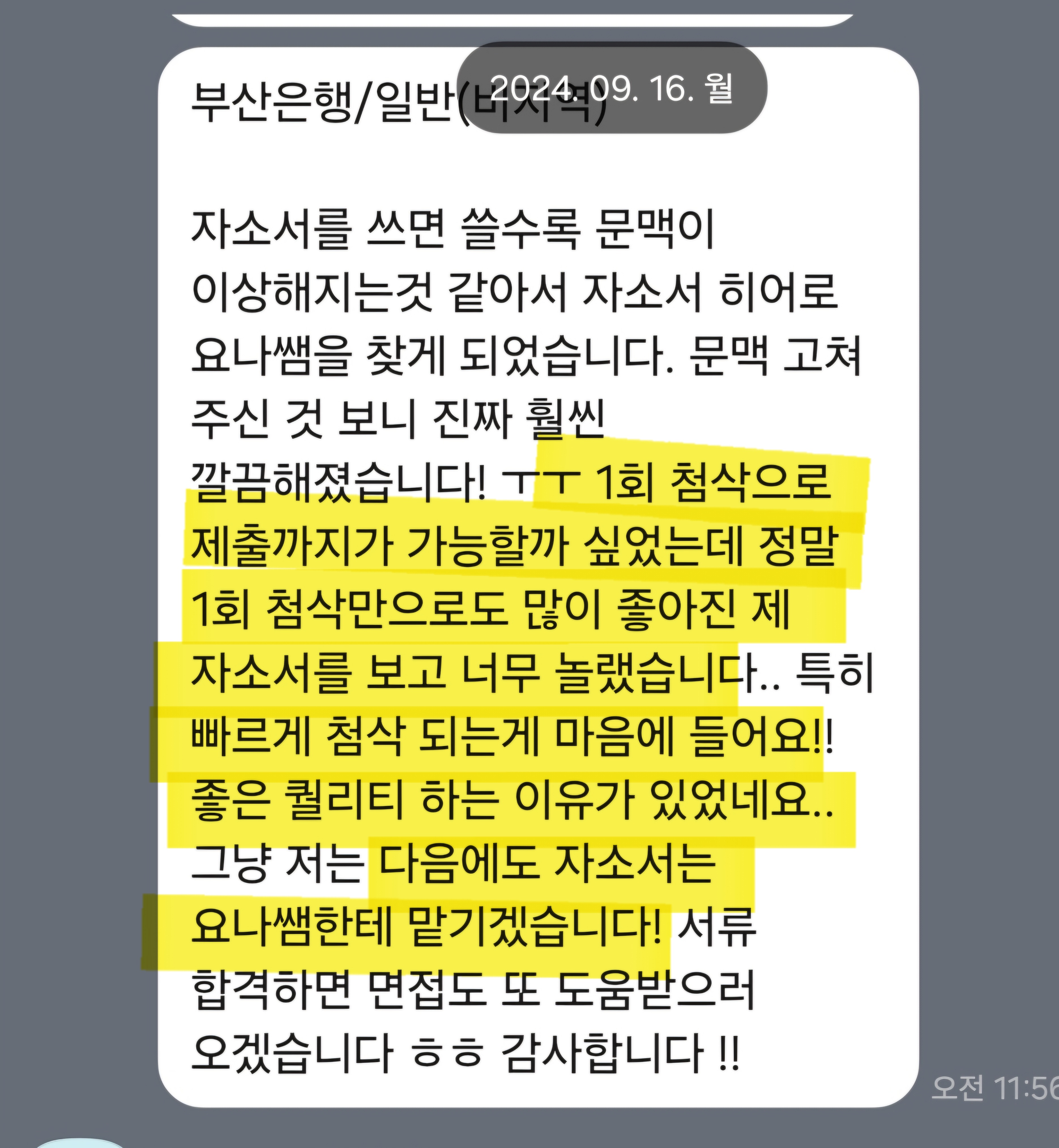 안녕하세요. 지난 10년간 95% 이상의 서류 합격률을 기록하며, 매년 3,000명 이상의 합격생을 배출하고 있는 취업 전문 컨설턴트, 자소서히어로 요나입니다.